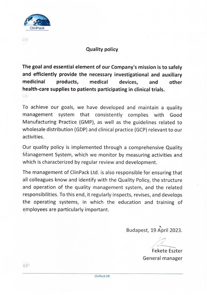 The management of ClinPack Ltd. is also responsible for ensuring that all colleagues know and identify with the Quality Policy, the structure and operation of the quality management system, and the related responsibilities. To this end, it regularly inspects, revises, and develops the operating systems, in which the education and training of employees are particularly important.